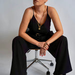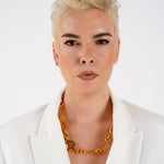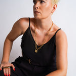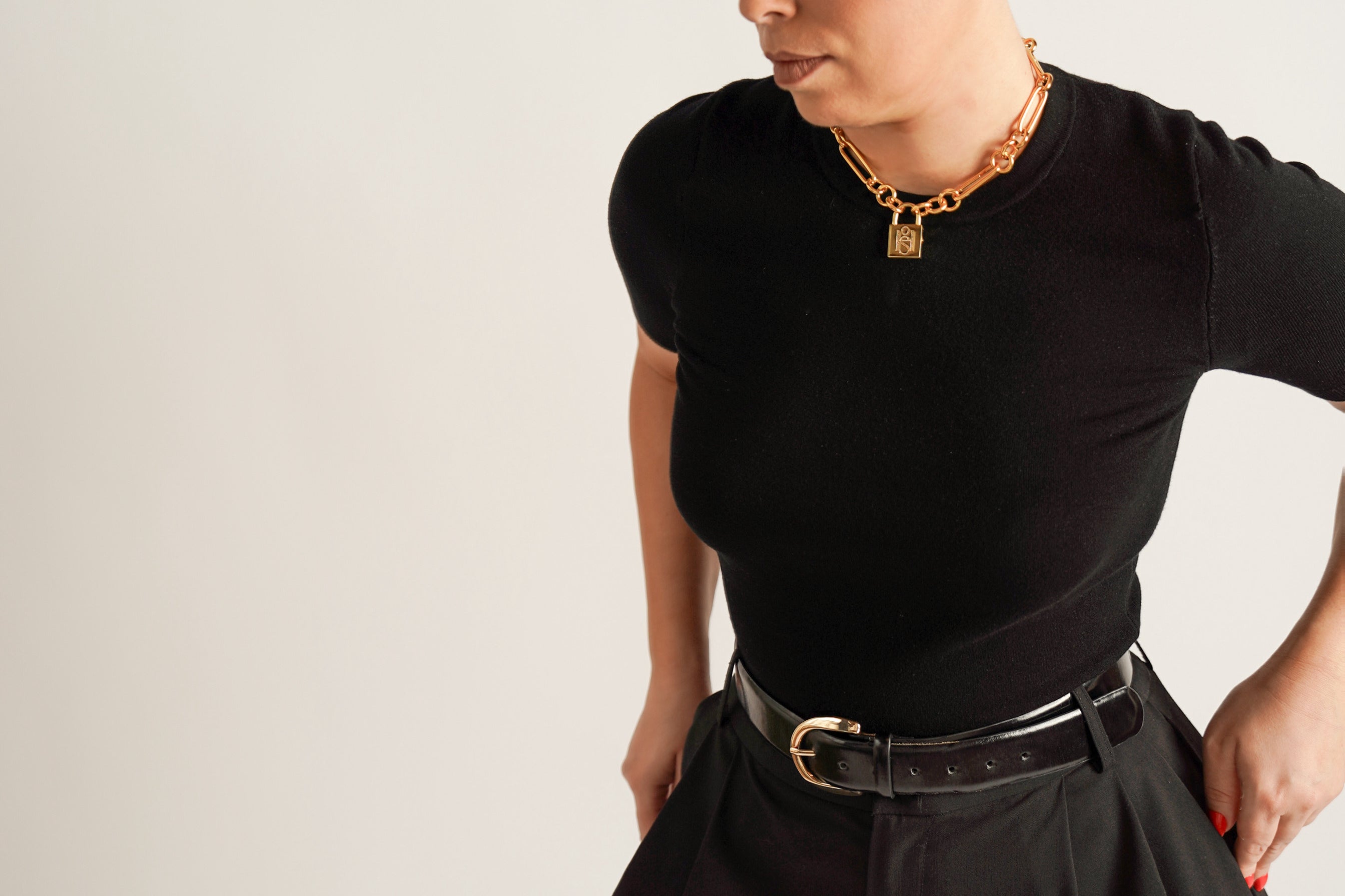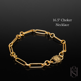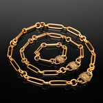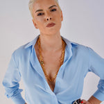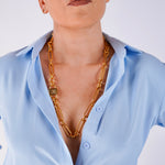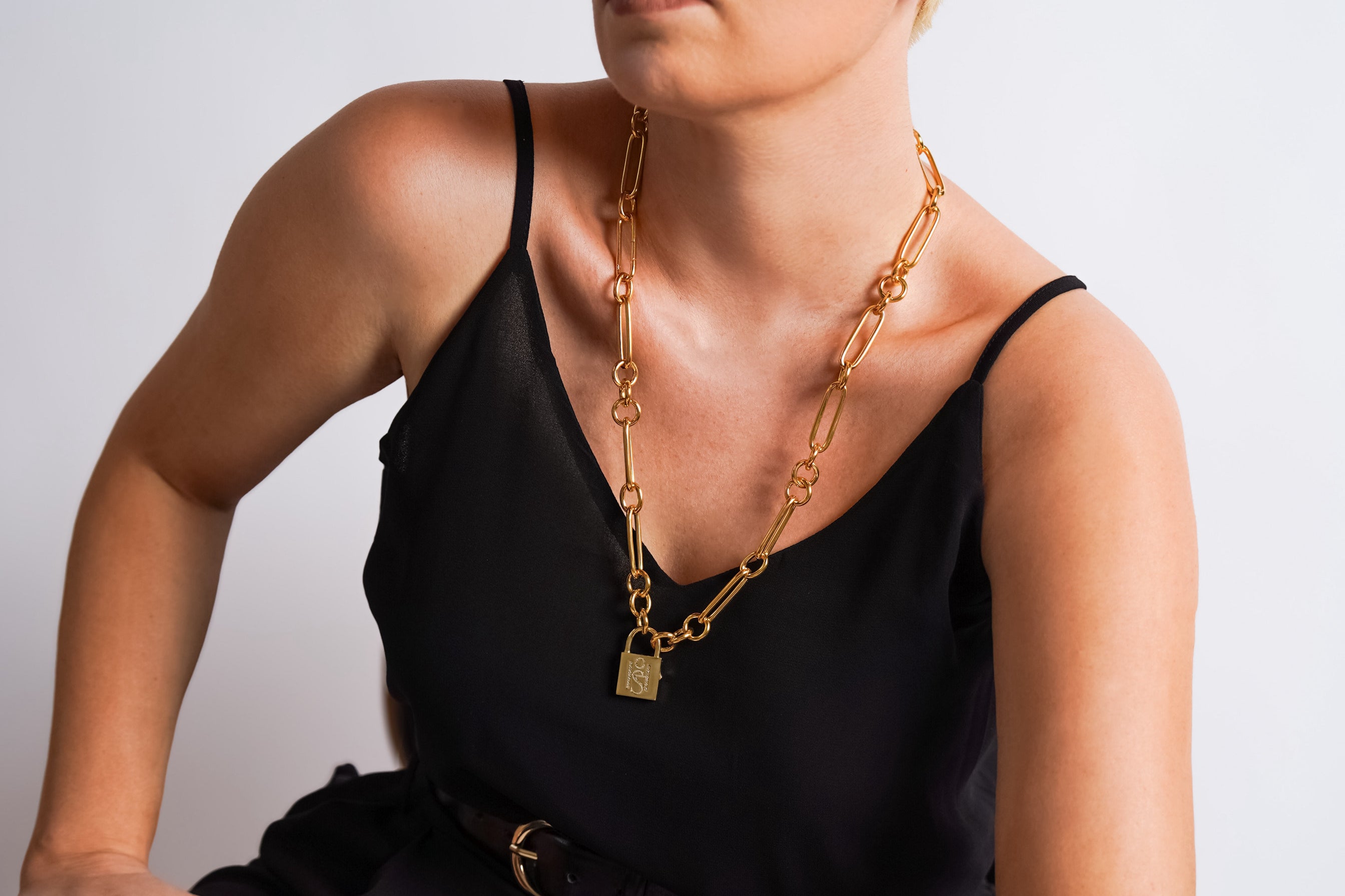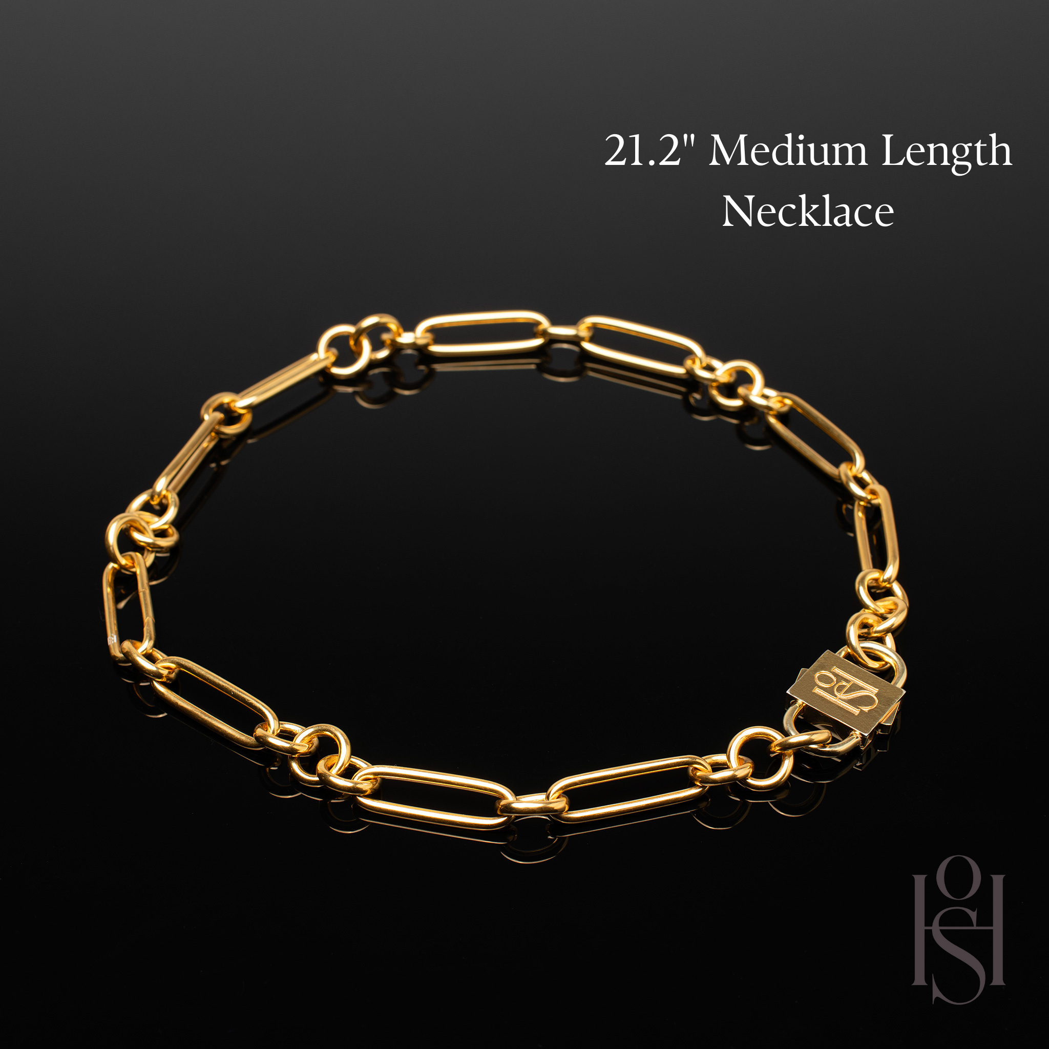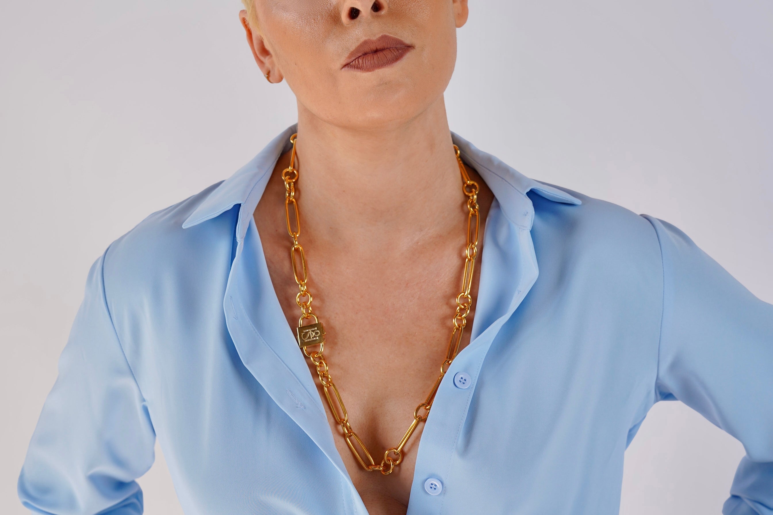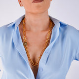 Our longest chain necklace design consists of two 16 cm fixed chains, one 30 cm fixed chain, two spring clasps, and a three-ring connector that we gift for free, which you wouldn't normally use on the necklace, but it allows you to separate your long necklace into four different models. This way, by separating your total 70 cm chain necklace without clasps, you can create the following models: