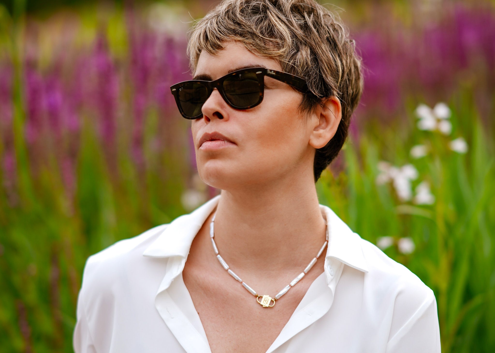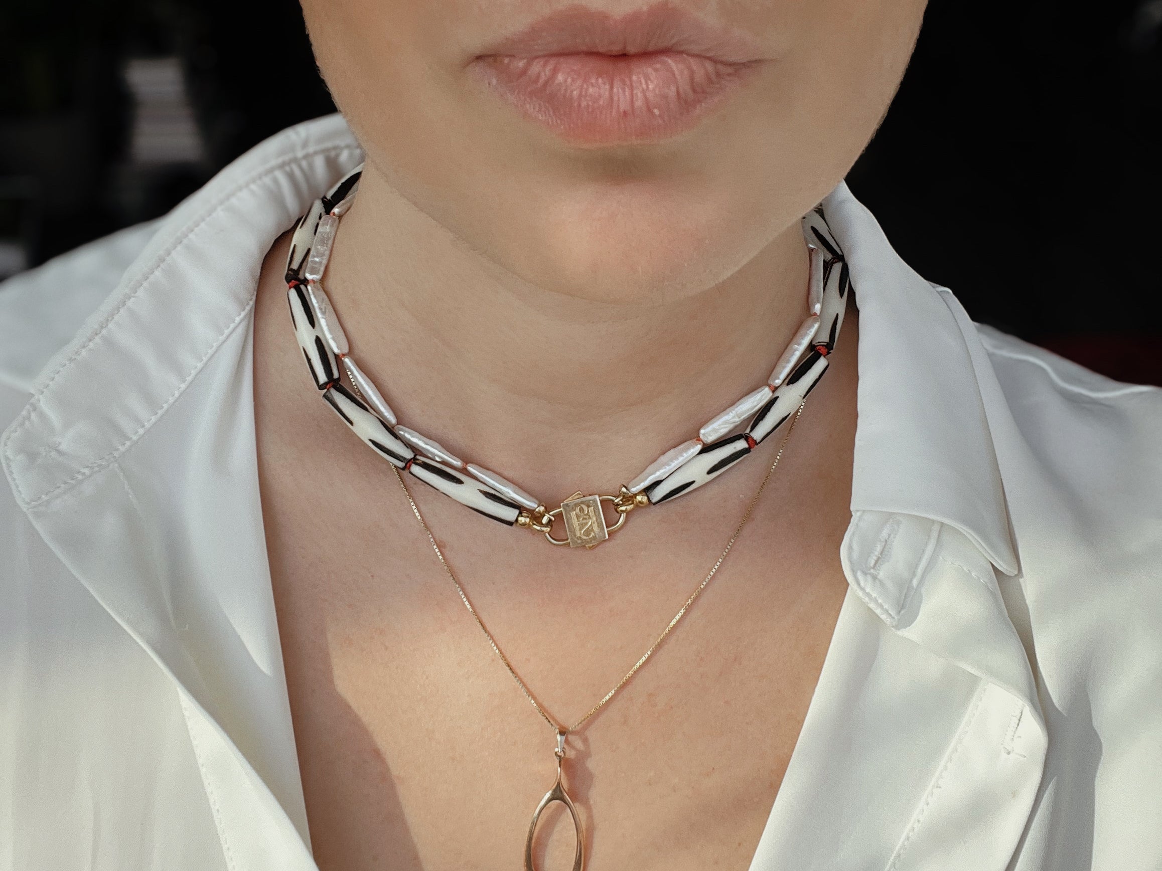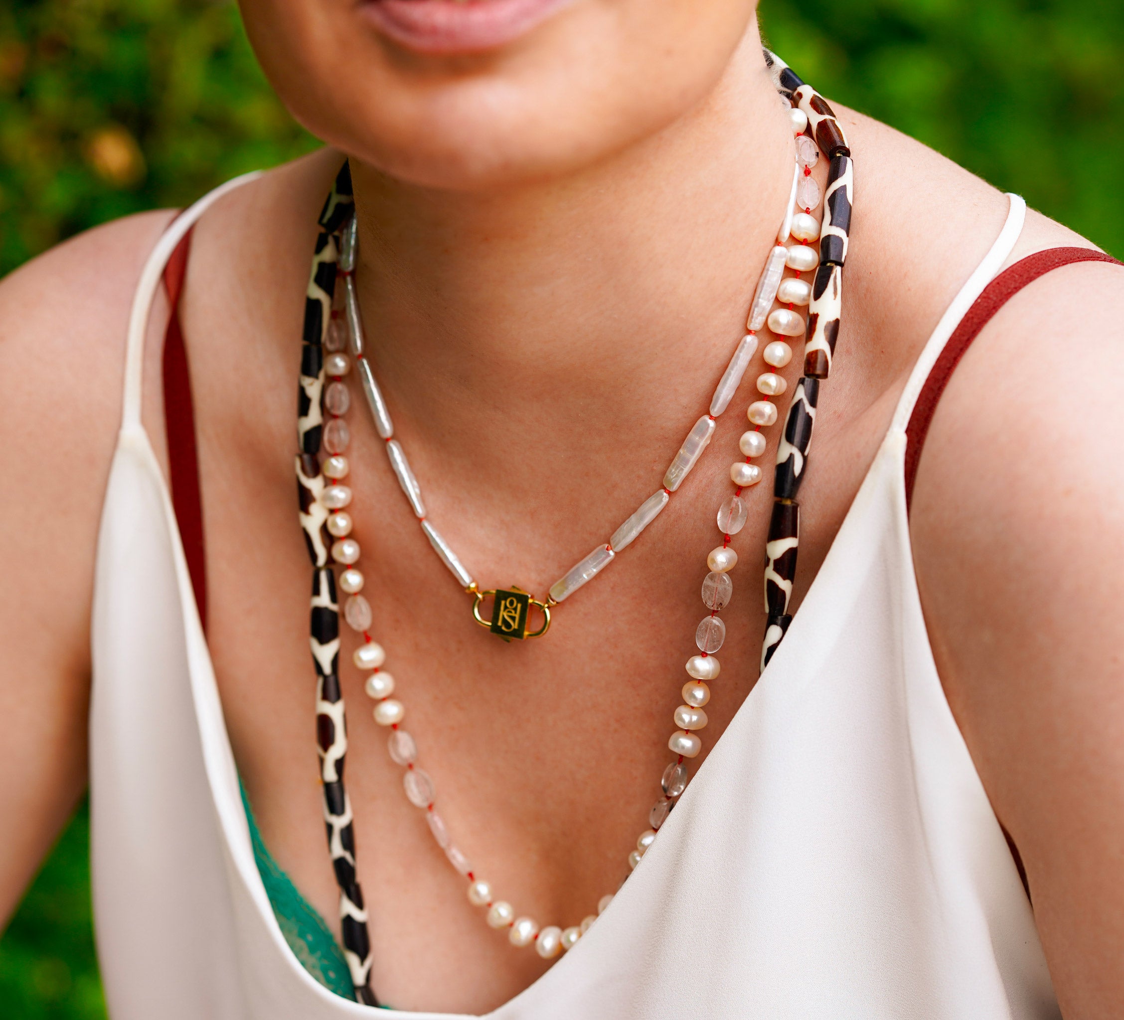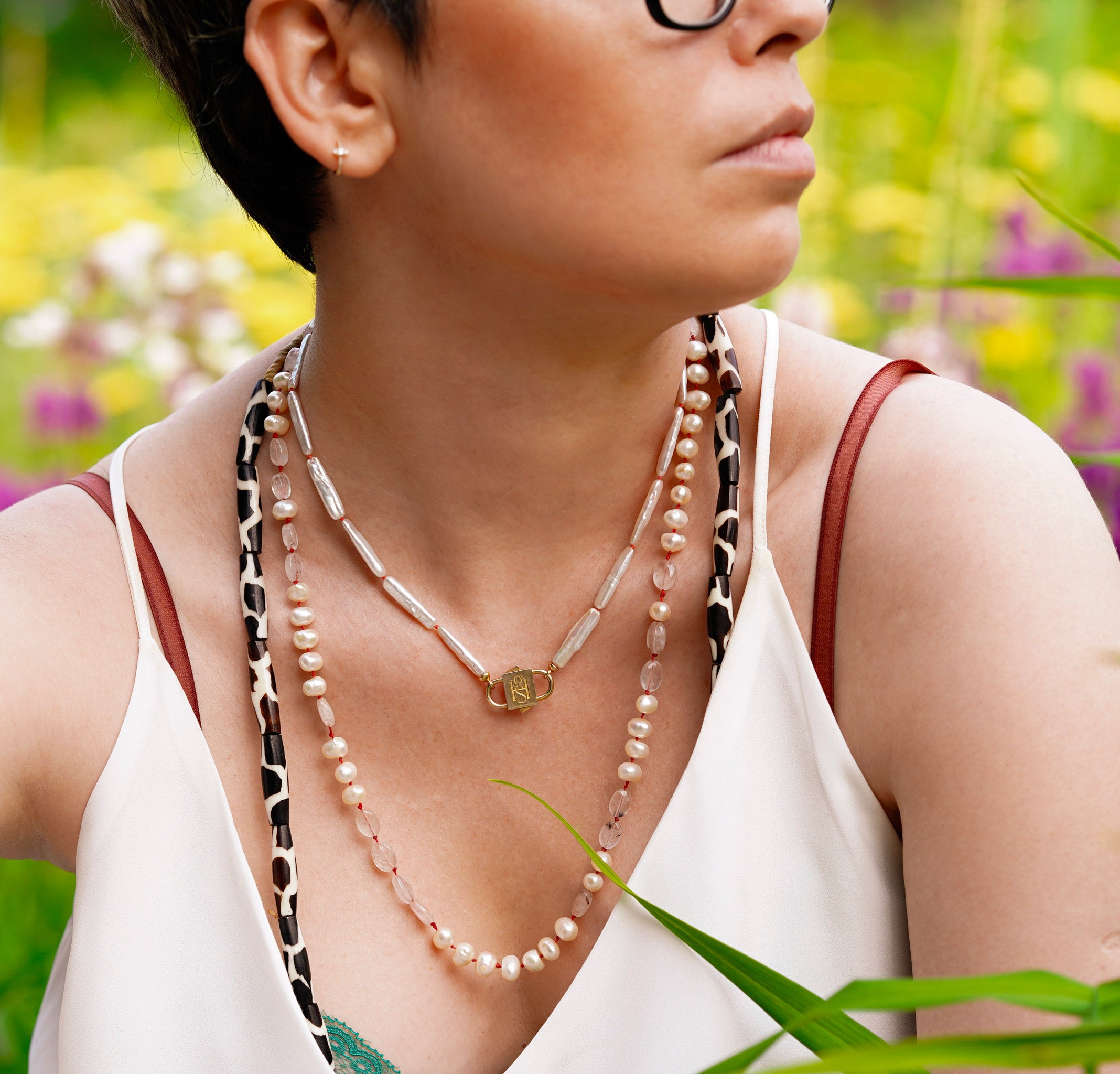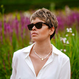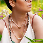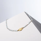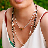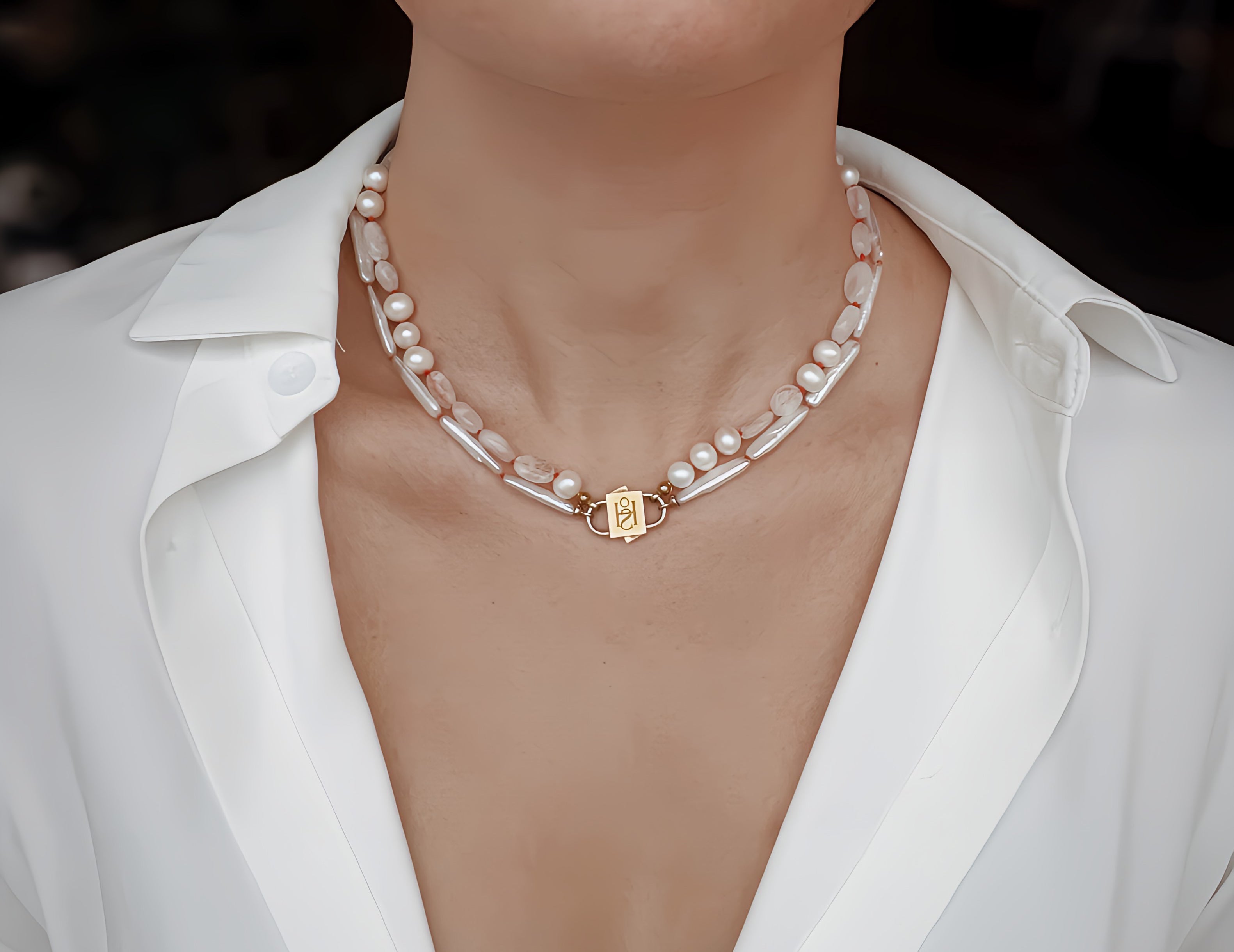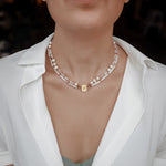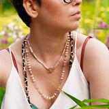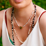 Say hello to Bébé Blanc. This isn't just a necklace, it's your new best friend that you'll want to pair with anything. It's made for the sea, the sun, and sun-kissed tans. Adorned with a 16-inch strand of unique Biwa pearls, each pearl is silk-knotted with care and precision. But that's not all. Our new Bébé Locks, masterfully crafted from 1-micron 24k yellow gold filled over 925 sterling silver, add an extra sprinkle of luxury.