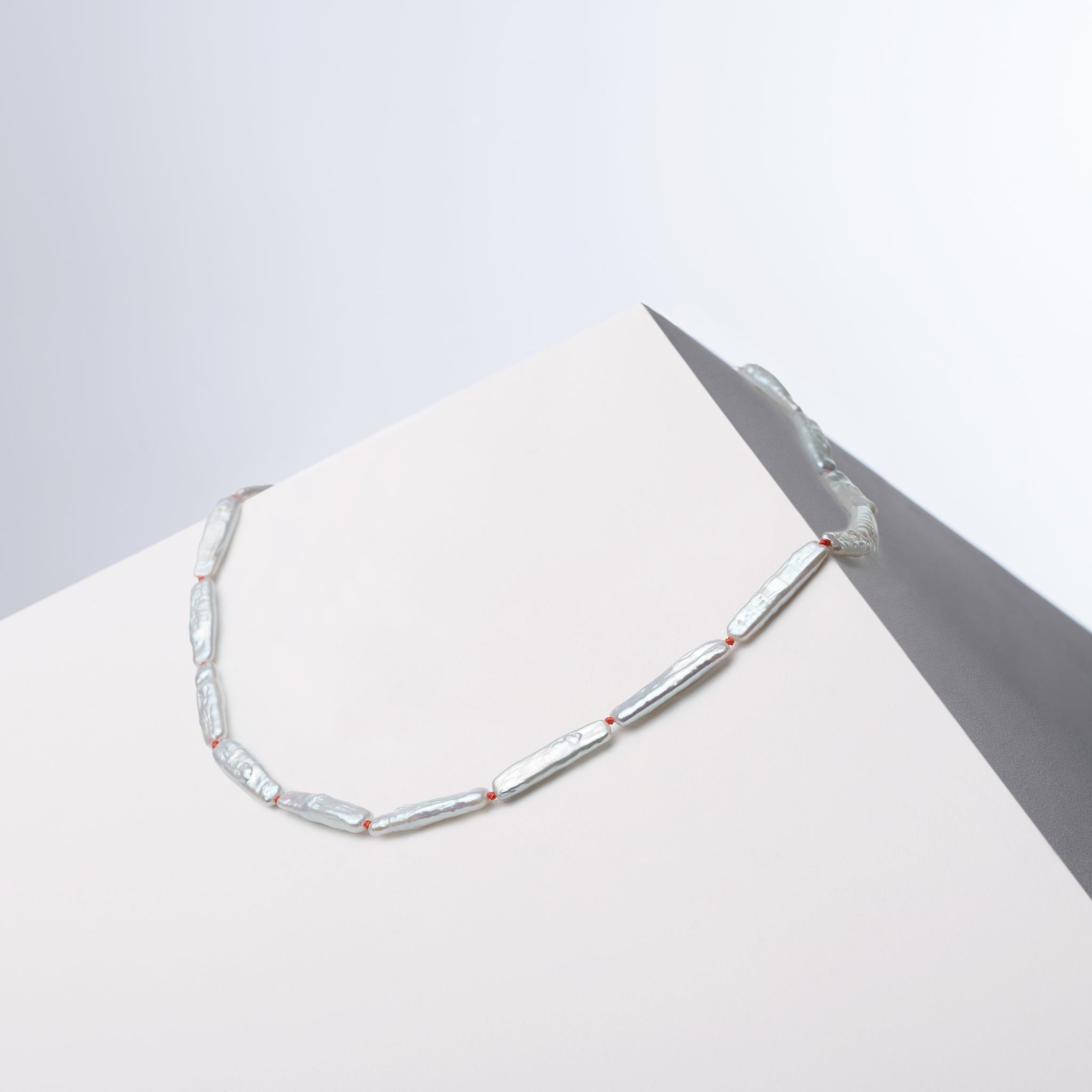 Bébé Blanc is intricately crafted using small, genuine Biwa pearls and the traditional silk knotting technique. This practice involves tying precise knots between each pearl, which not only enhances the necklace's elegance but also boosts its durability. Despite requiring skill and patience, this method delivers high-quality results that surpass those of conventional lining techniques.