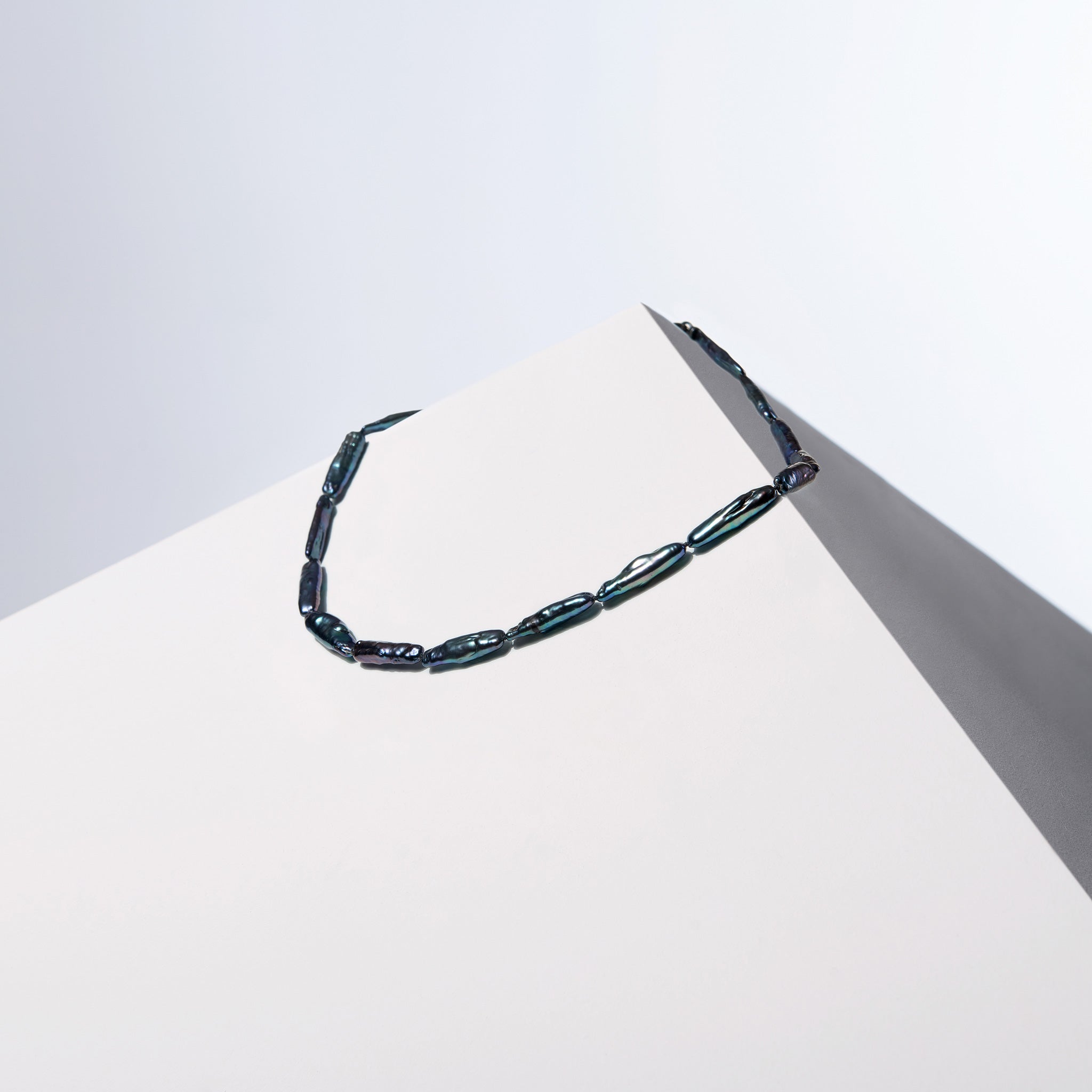 Bébé Noir is crafted using genuine Peacock Gray Biwa pearls and the traditional silk knotting technique, enhancing both elegance and durability.