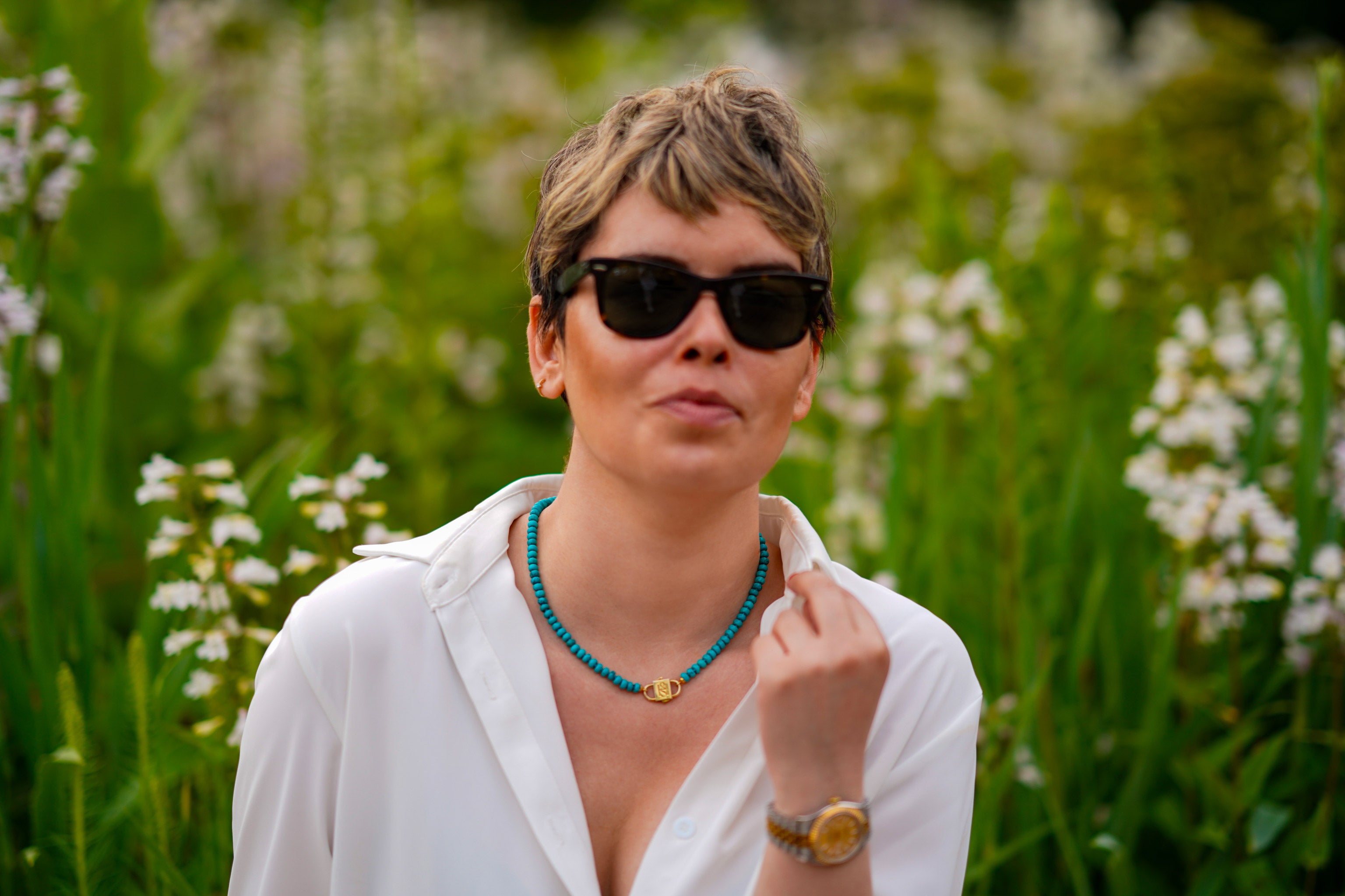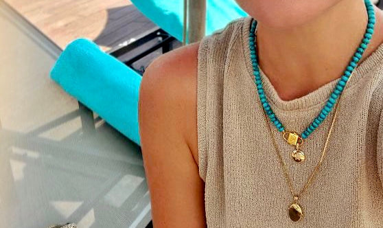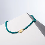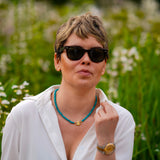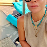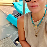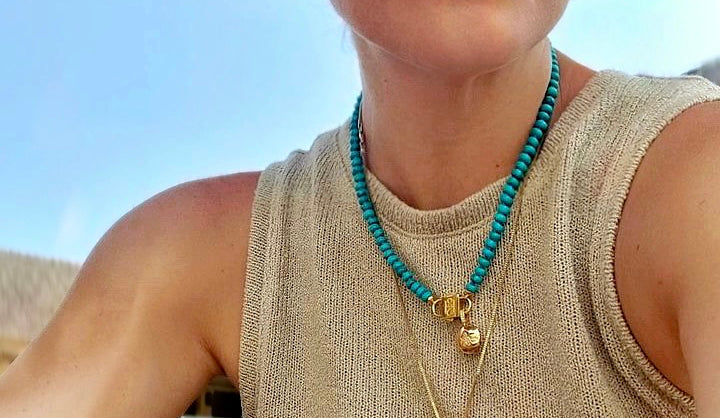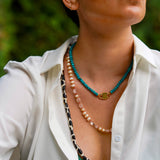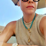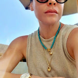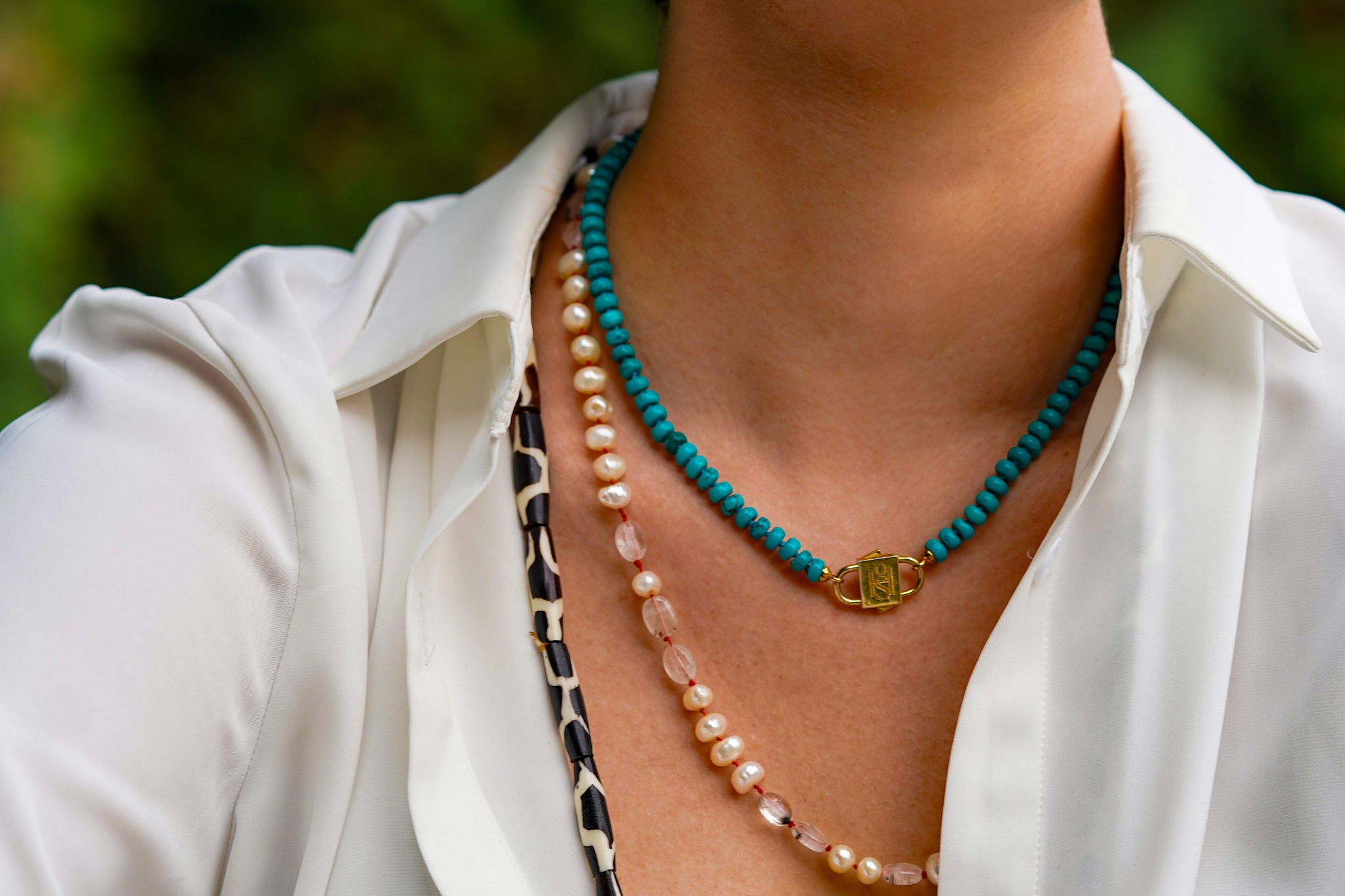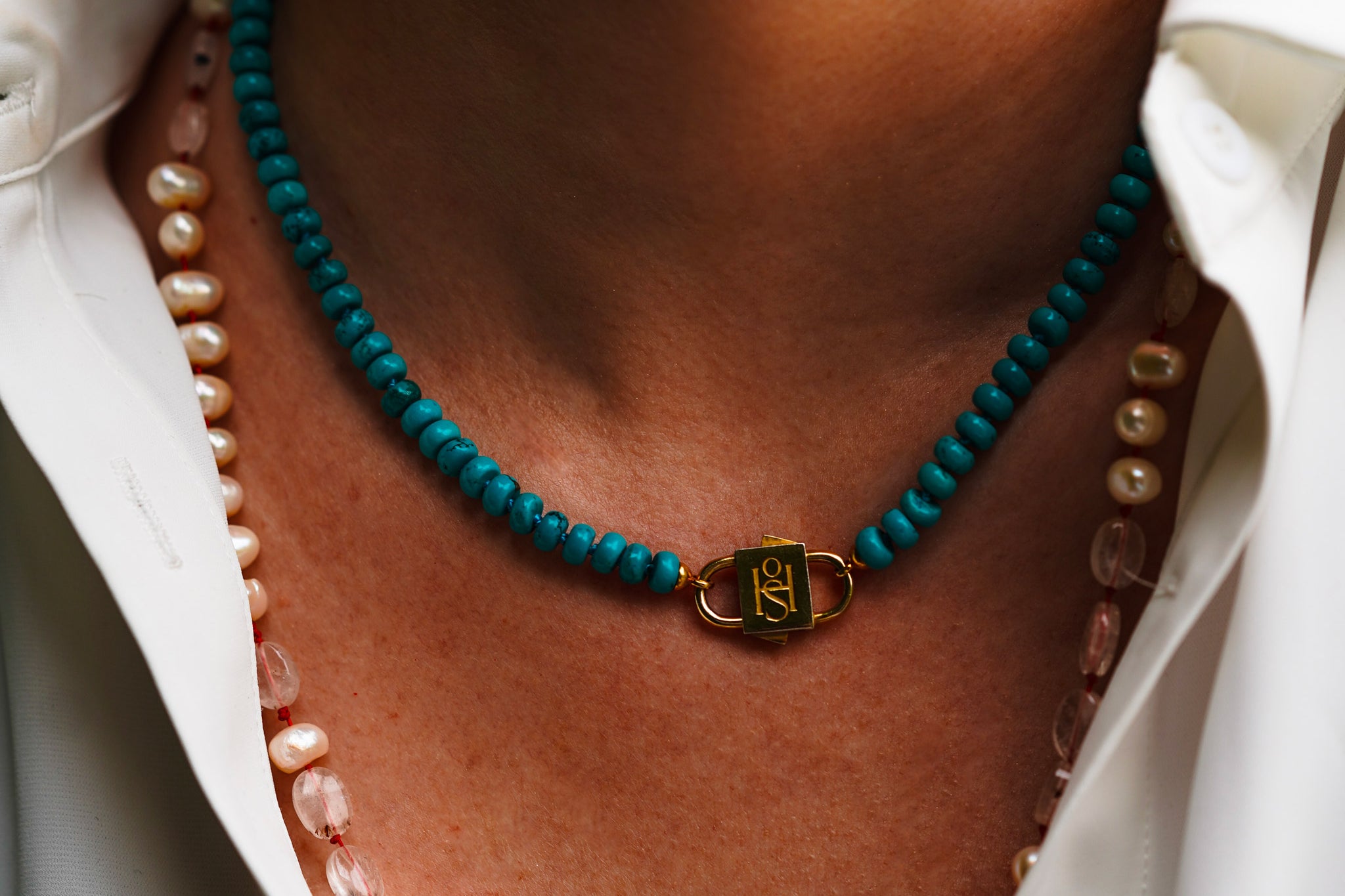 This stunning Turquoise piece is handcrafted with intricate attention to detail, featuring small rondelle turquoise beads, each one carefully silk-knotted. The design is completed with our brand new 925 silver HoS Bebe lock, filled with 1 micron yellow gold for that extra touch of luxury. Wear it with pride and let it become your new favorite companion.
