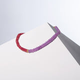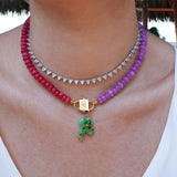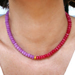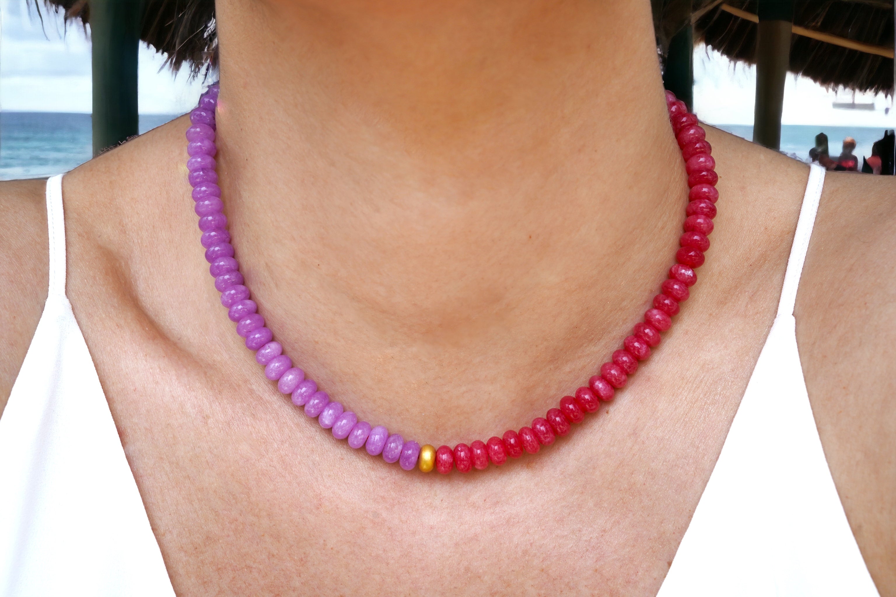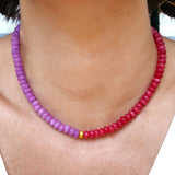 This exquisite statement piece is crafted using Rhodonite and Kunzite colored Jade beads, each precisely cut to an 8 mm size for uniformity and elegance. The vibrant pink and purple hues of the beads make a captivating contrast that truly stands out. At the heart of this necklace, you will find a unique centerpiece - a gold-filled silver bead with a sandblasted finish, providing a touch of rustic charm amidst the polished jade.