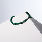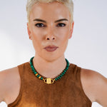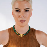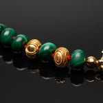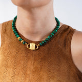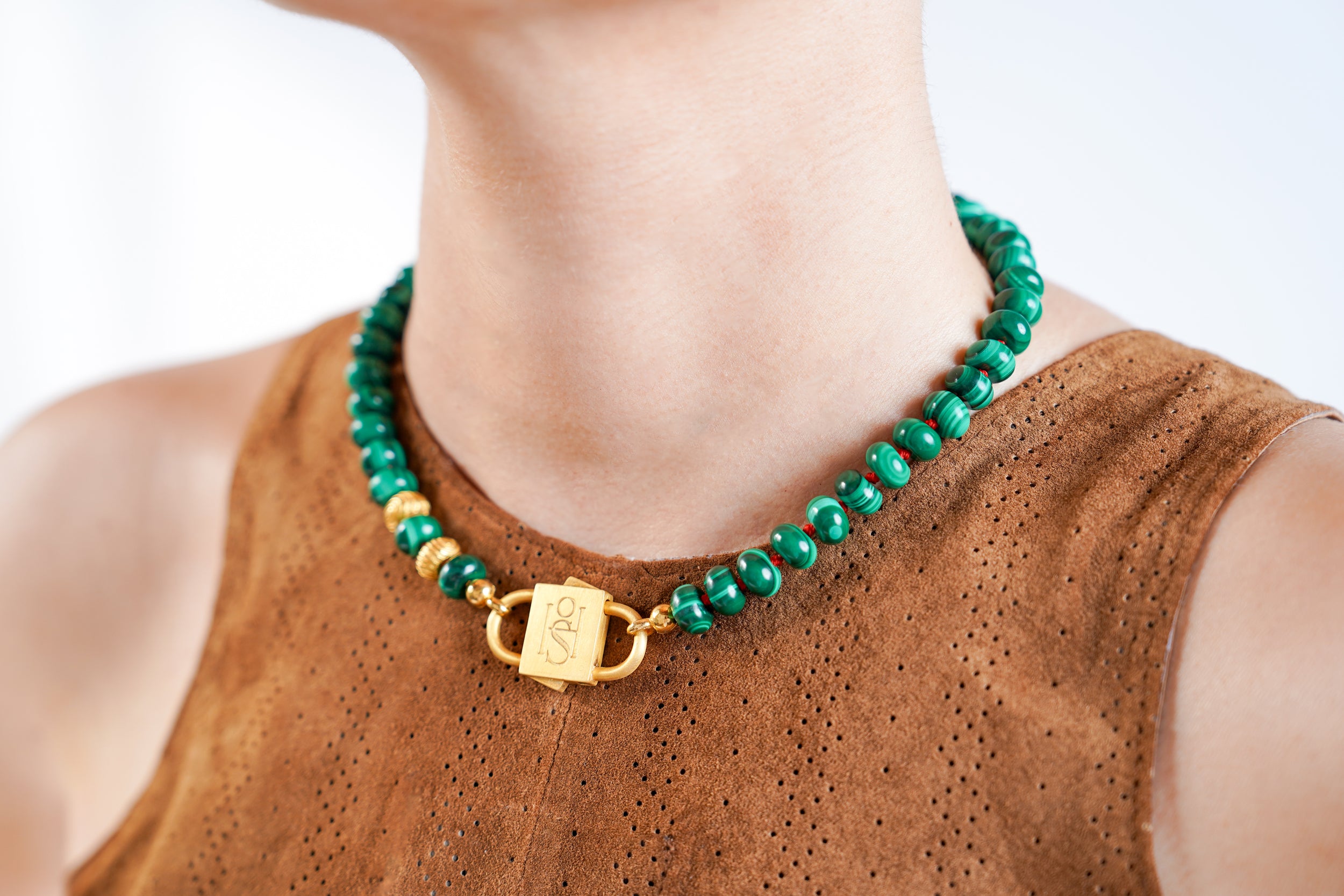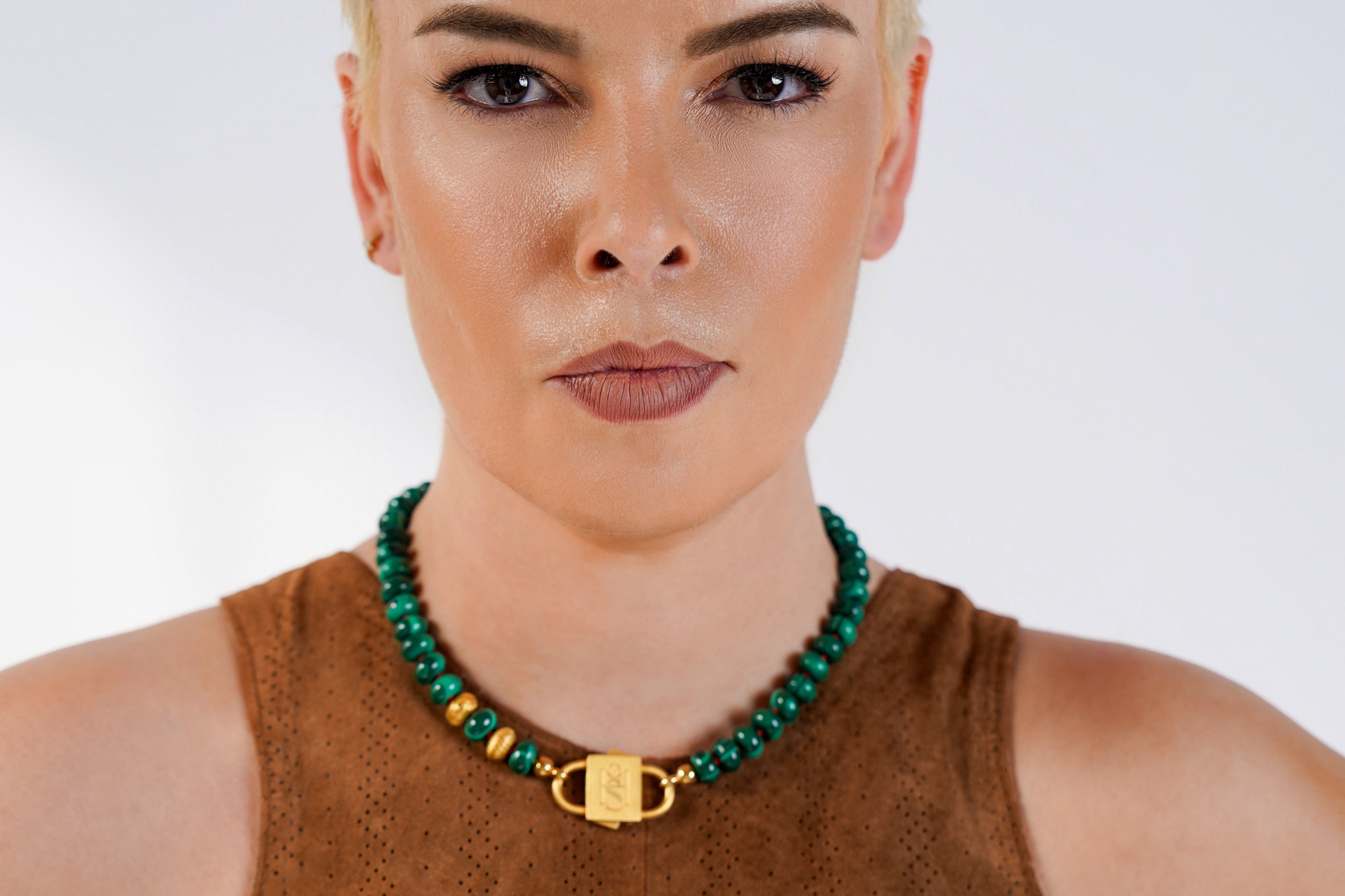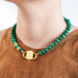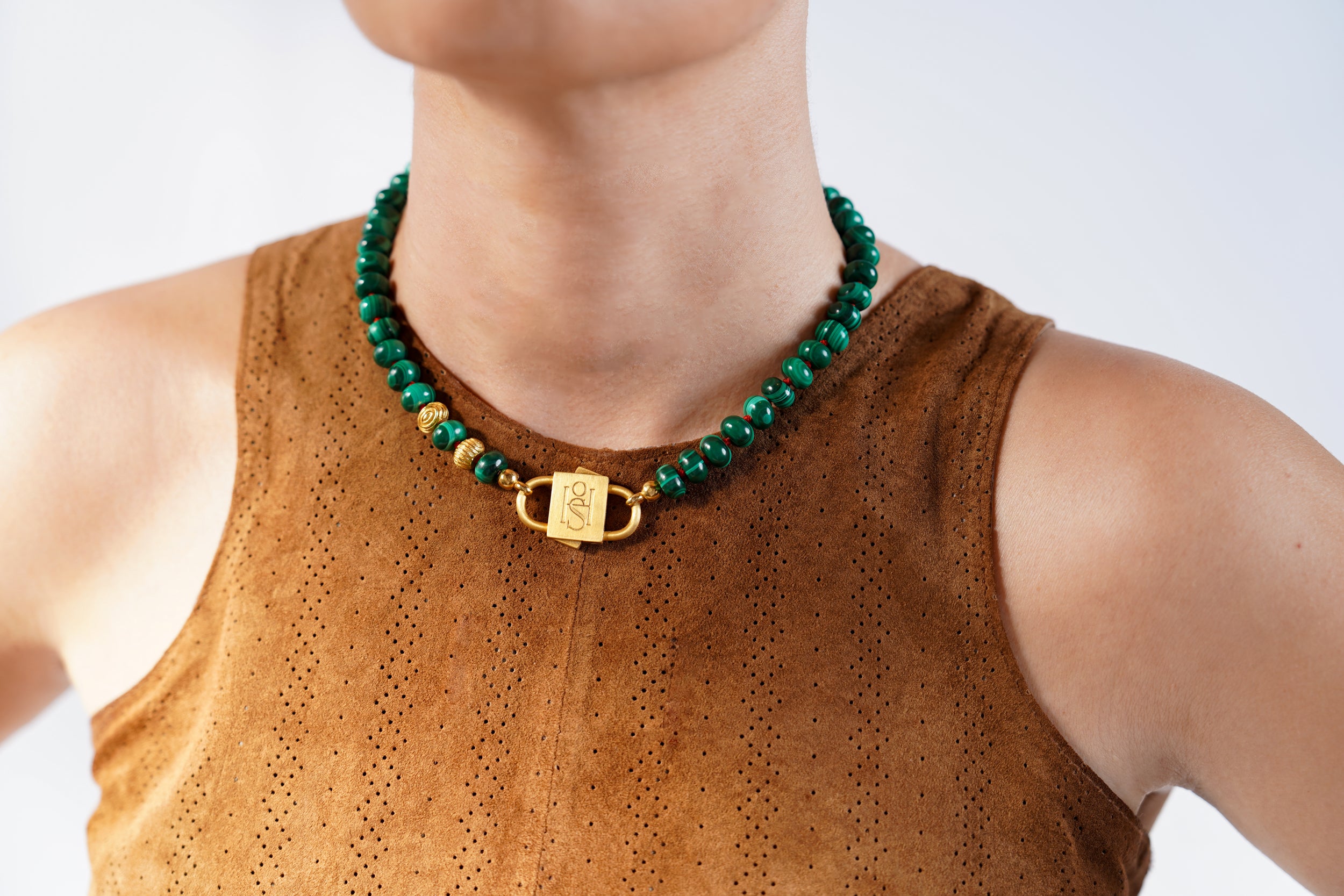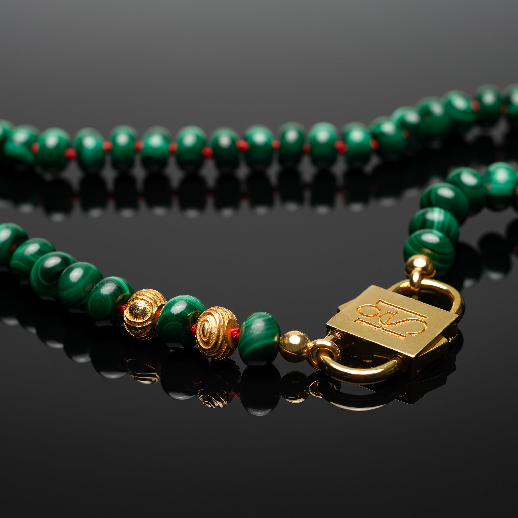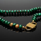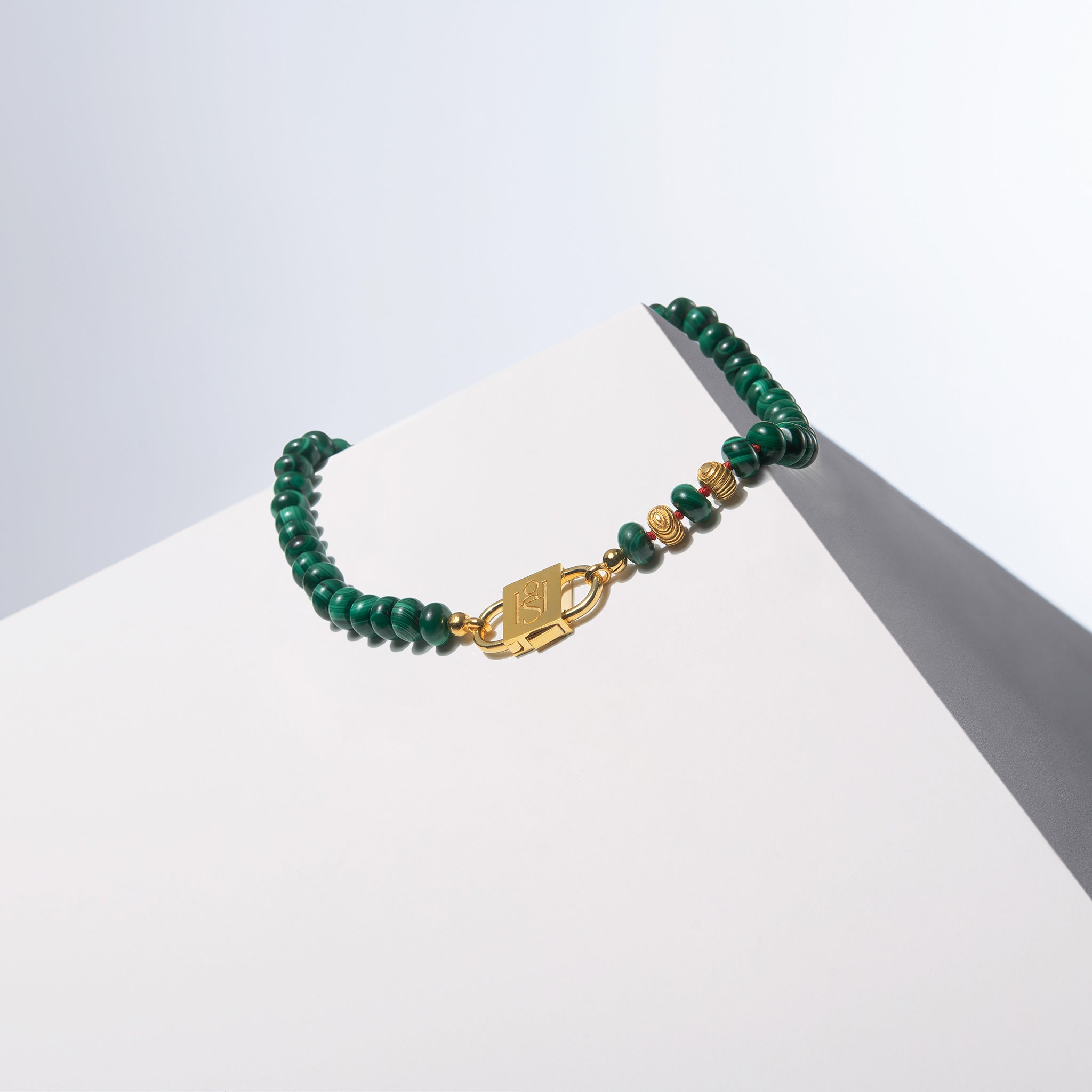 The Iris necklace features high-quality rondelle malachite beads, adorned with two 24k gold, 1-micron filled over 925 sterling silver malachite ornaments, and an optional HoS Lock.