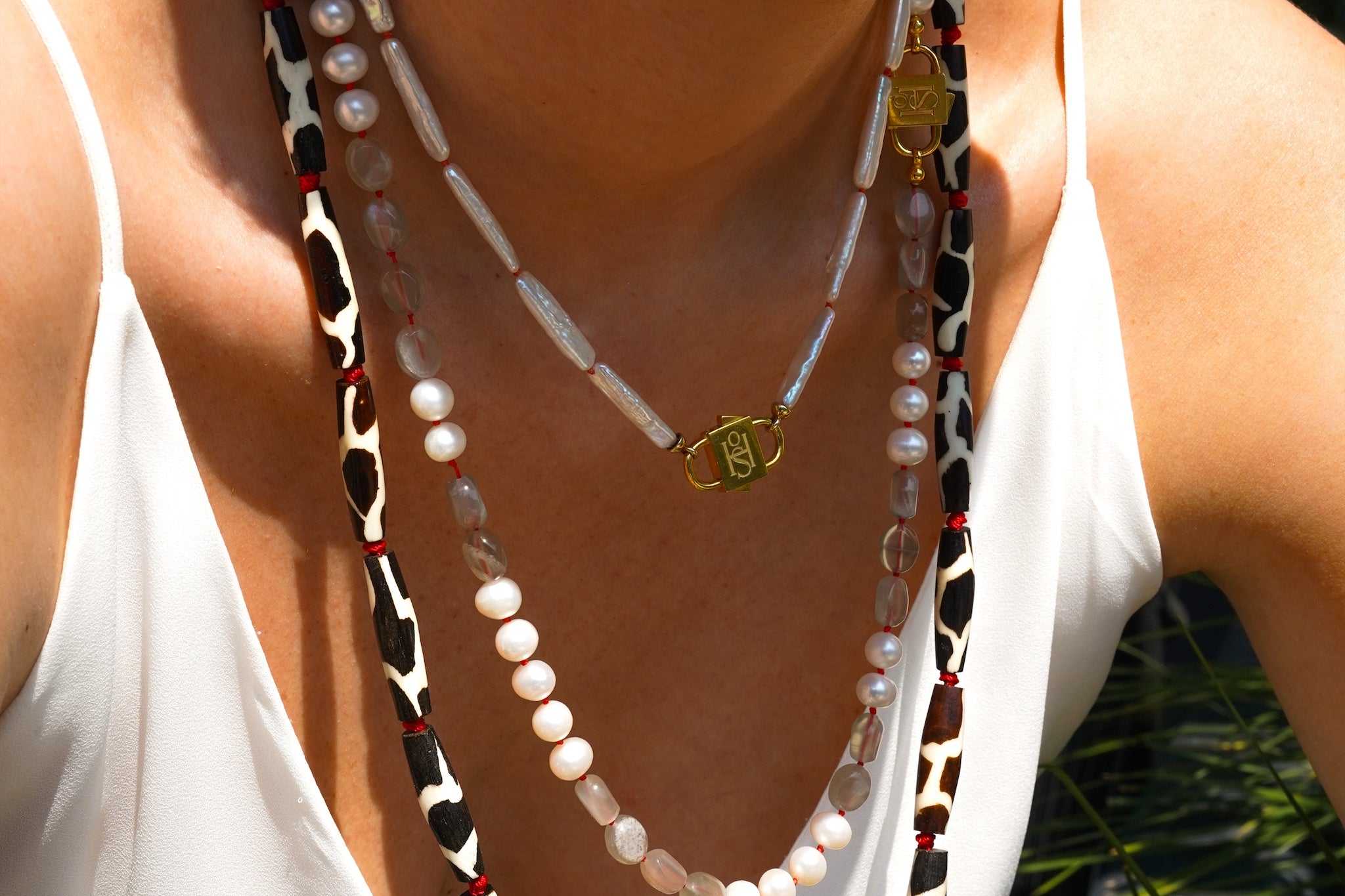 The 'Iwi' necklace is a highly unique piece of jewelry, meticulously crafted from elongated bone batik beads. These beads showcase an exotic Giraffe design that originates from Kenya, Africa, bringing a slice of the wilderness into every day. Each bead used in the creation of this special piece measures approximately 2-2.5cm in length, striking the perfect balance between subtlety and statement. Adding to its charm, the necklace is hand-knotted with vibrant red silk. This not only adds a luxurious touch but also ensures durability and comfort for the wearer.