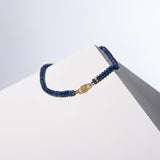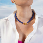 The necklace is crafted from Lapis Lazuli, with each bead uniformly shaped into an 8mm rondelle.