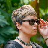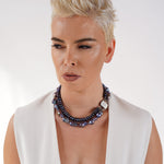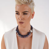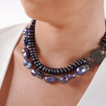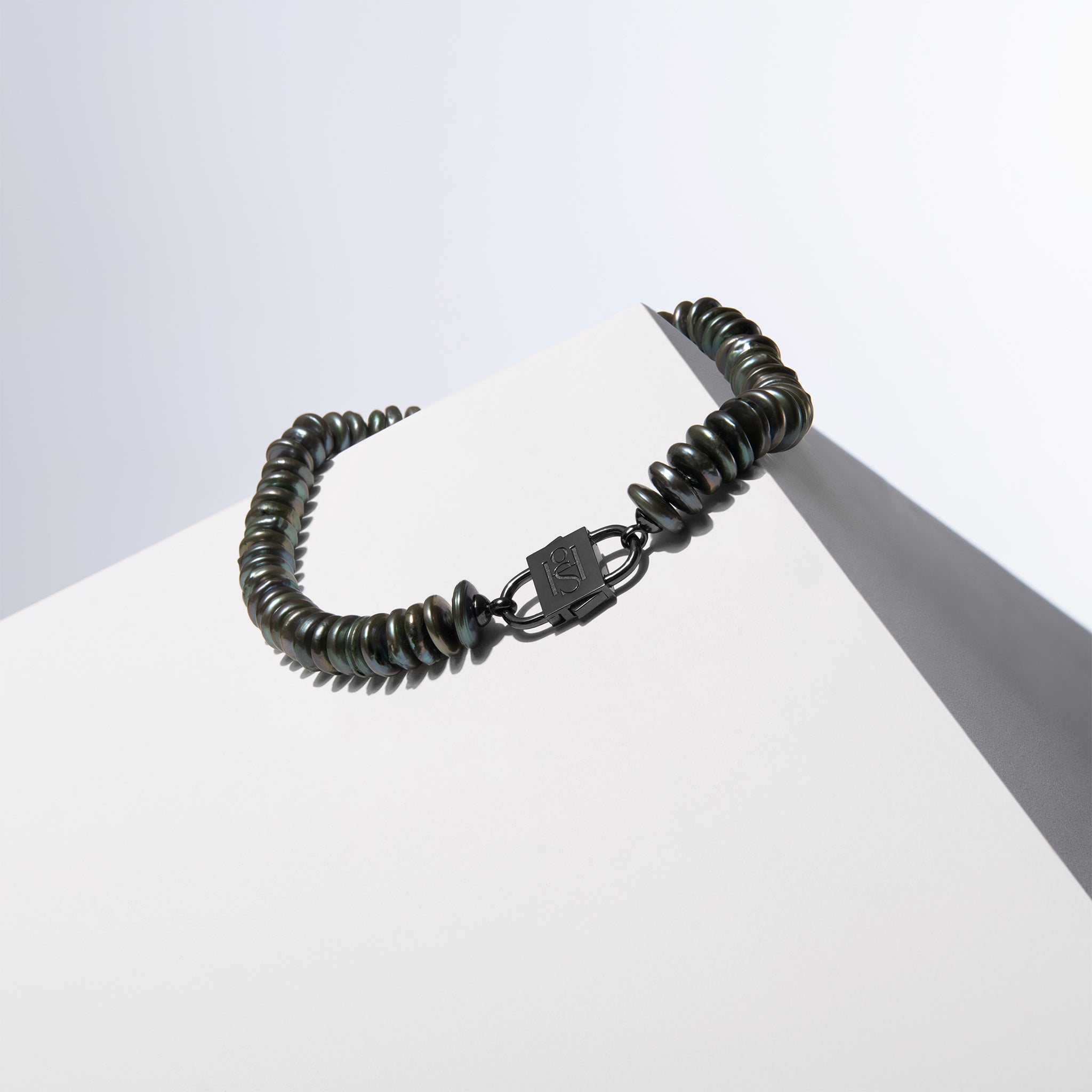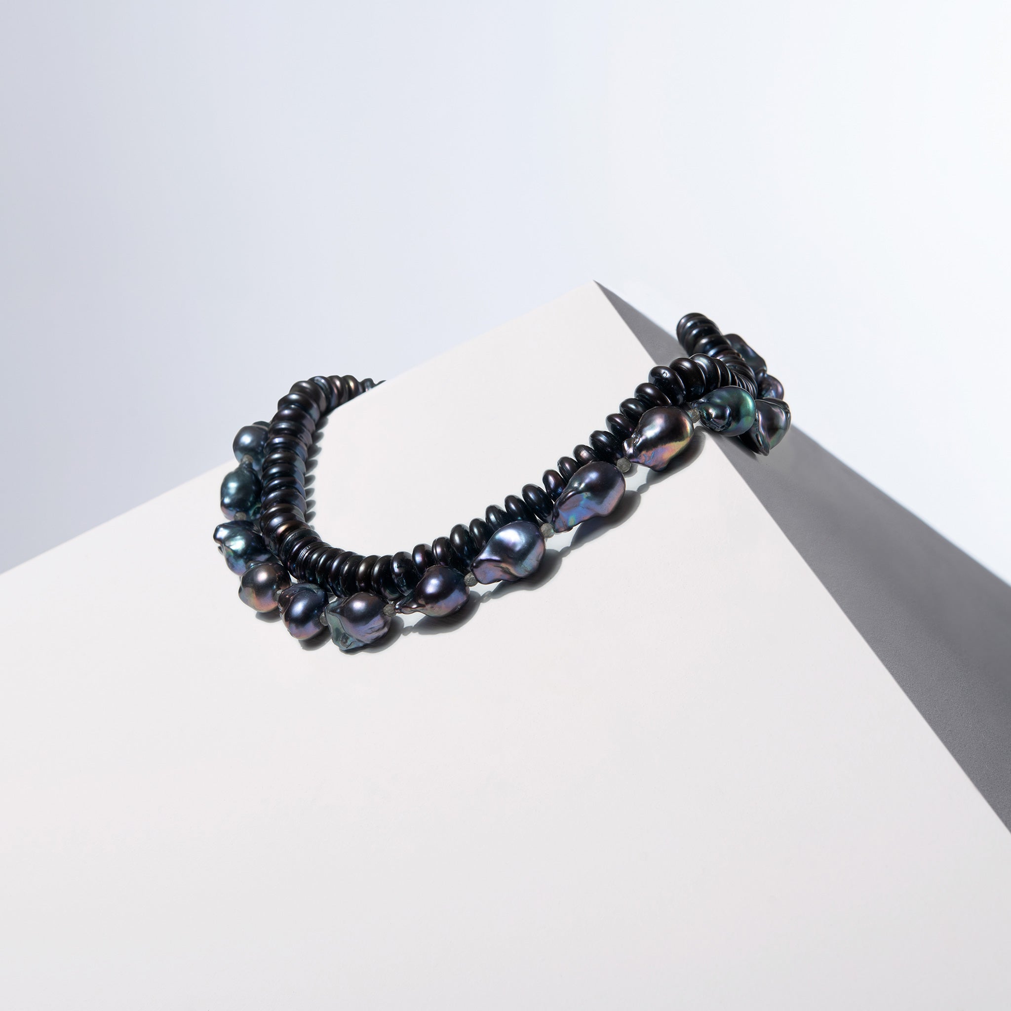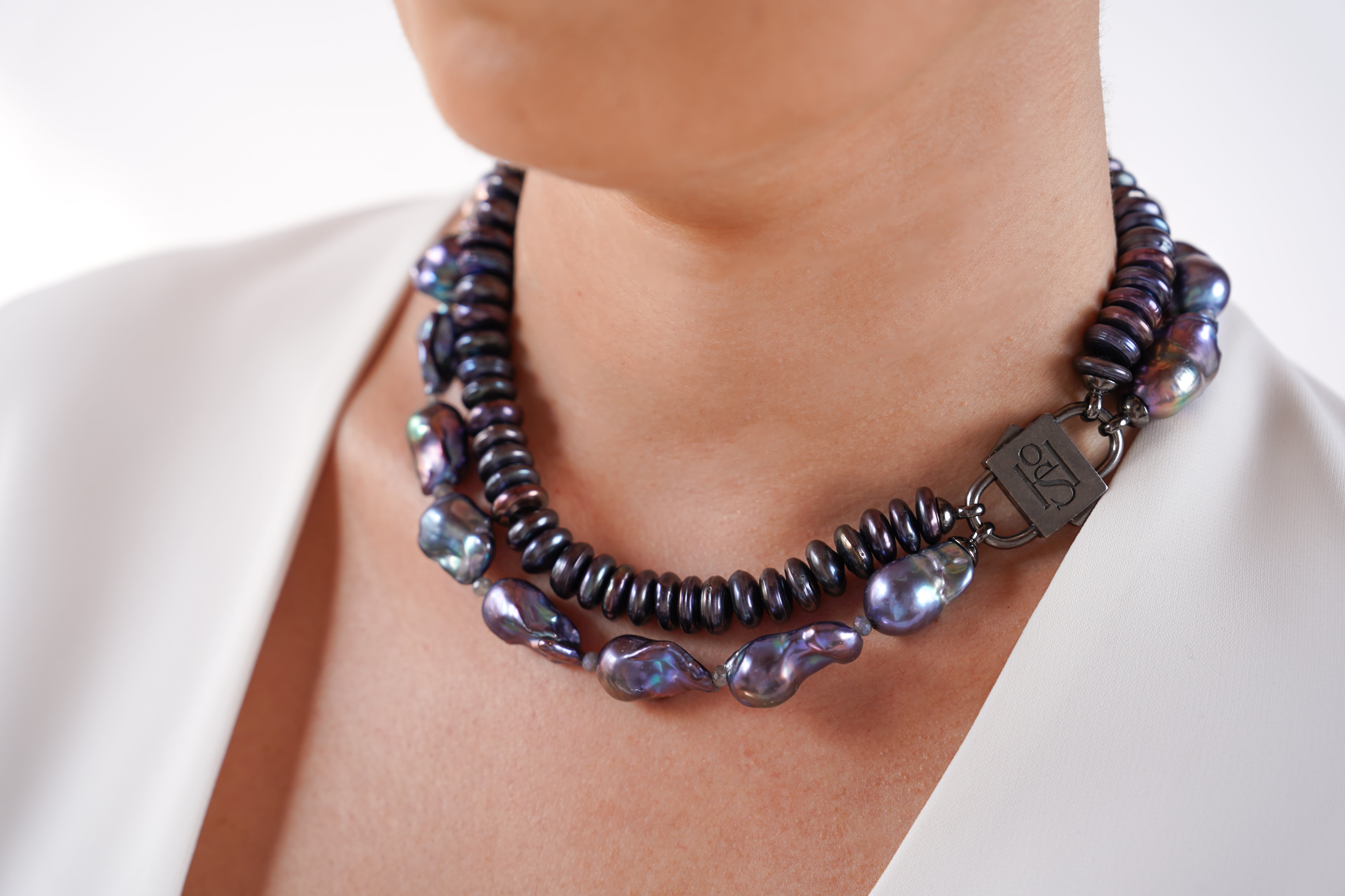 Simone, named after the legendary Nina Simone, is the cool sister of our best-selling Peggy model. Like Peggy, it features a combination of peacock gray baroque and rondelle pearls, which can be used separately or together with its black gun HoS lock.